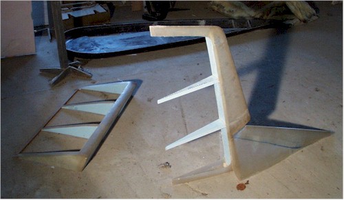 Probably according to many other countries regulations too. What was the main goal of the designer of the Pelican, J.C. Debreyer? He wanted to prove that you can fly with only 10 HP. And he did prove it. During my talk with Michel Mangenot I asked him if you needed to be a experienced pilot to fly the Pelican. "On the contrary", he said, "it is a ideal plane for a beginner with limited resources (= money). It is cheap and stable enough for a beginner." When he said cheap I had no problem to believe. The next picture shows one of the rudders and the elevator in construction. Do you see the blue foam?